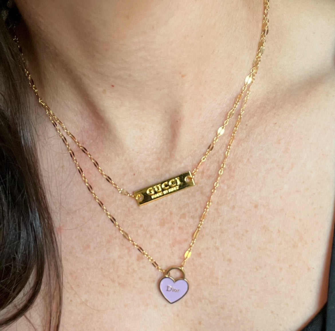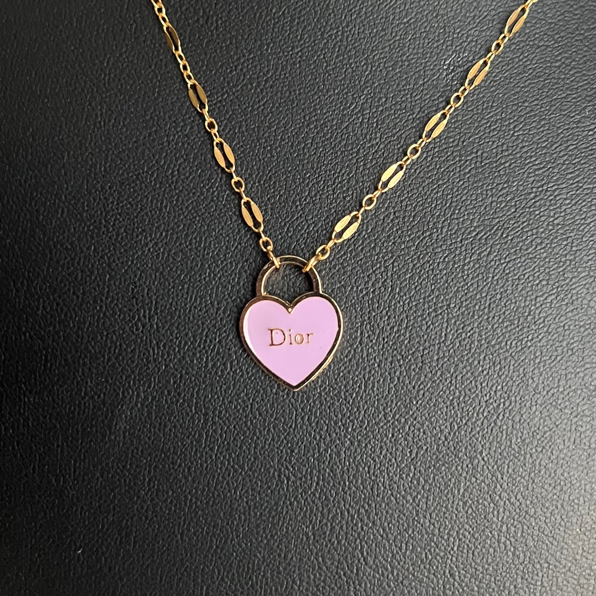 This is an authentic Dior zipper pull that has been upcycled into a necklace. The chain is 14k gold filled and the length at its shortest is approximately 16 inches, and can be extended to just over 18 inches.