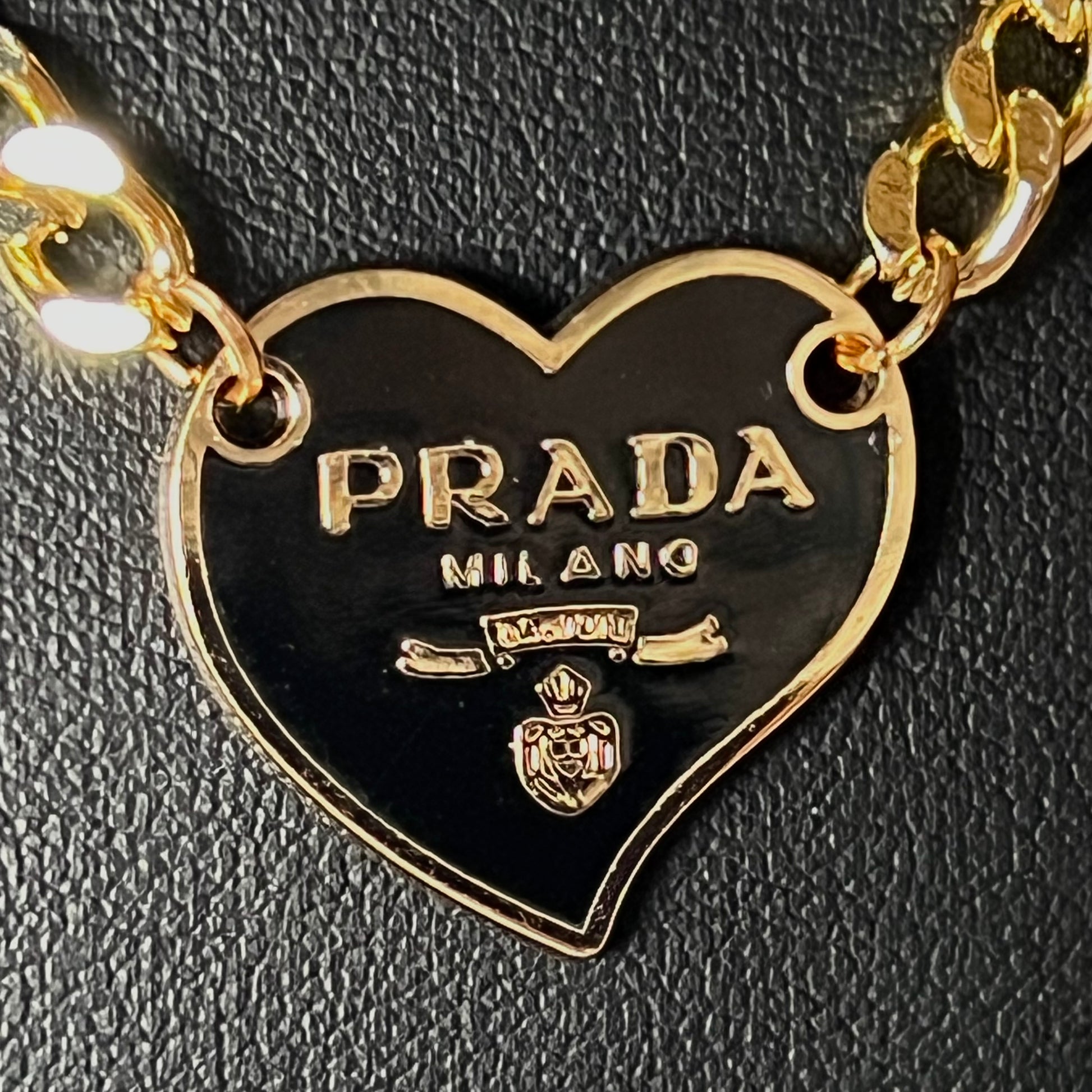 This authentic Prada bag tag has been repurposed into this adorable necklace. This chain is approximately 16.5/17 inches at its shortest, and can be extended an extra two inches (slightly over two inches). The chain is heavy duty, and is 14k gold filled.