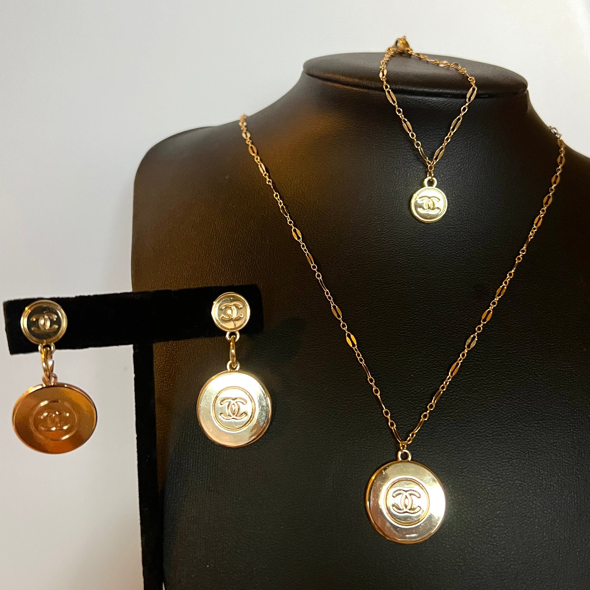 This trifecta comes as a full, three piece set: the Chanel zipper-pull earrings, necklace, and bracelet. The bracelet and necklace chains are 14k gold filled. The bracelet is approximately 6 inches at its shortest and can be extended to just over eight inches. The necklace is approximately 16 inches at its shortest and can be extended to just over 18 inches. The earring posts are hypoallergenic stainless steel.